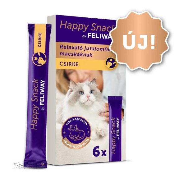 A Happy Snack by FELIWAY egy krémes, csirke ízesítésű jutalomfalat alfa-kazozepinnel, egy természetes, megnyugtató hatású tejfehérjével, amely segít a cicának ellazulni otthon vagy útközben. Egy csomagban 6 db Happy Snack by FELIWAY jutalomfalat található hozzáadott cukor és a tartósítószerek nélkül.