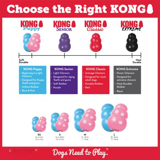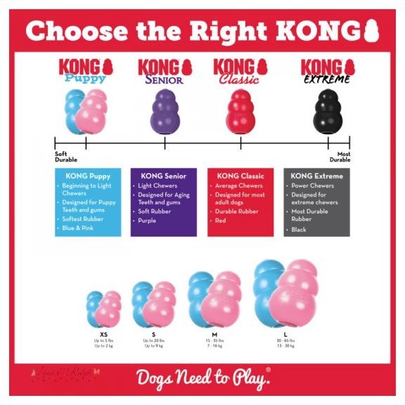 Rágcsálás barát nem mérgező nem dörzsölő és nem válik élessé vagy szálkássá a rágástól. A felmérések azt mutatják hogy az állatorvosok és kutya idomárok a KONG játékokat ajánlják a legtöbbször világszerte. A PUPPY KONG nagyon jó eszköze annak hogy a kutyusok egészséges fejlett kutyákká nőjenek. Az egyedülálló PUPPY KONG fogzást segítő gumijáték puhább mint a standard alapanyag de ugyanakkor ez is megtartja legendás erejét és tartósságát. A PUPPY KONG három szuperrugalmas méretben kapható. Az állatorvosok és a trénerek a PUPPY KONG megtöltését ajánlják amely elősegíti a szeparációs szorongás illetve más viselkedési problémák legyőzését. Elősegíti a helyes gátolja a helytelen rágási technika kialakulását.