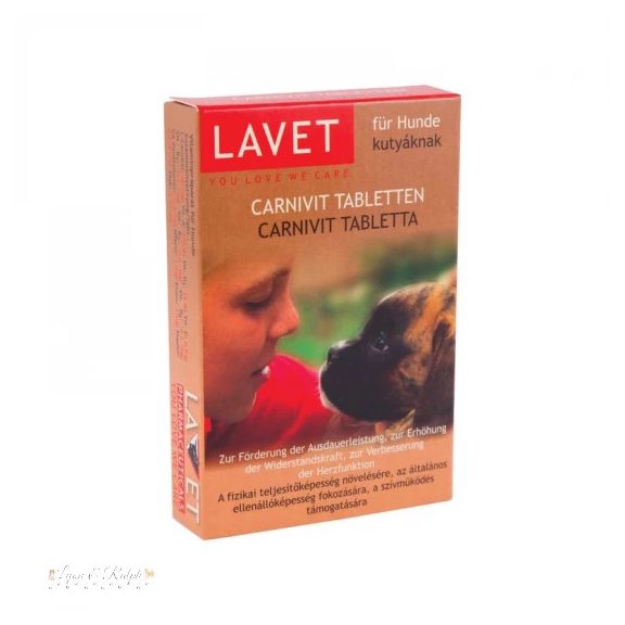 Lavet Carnivit tabletta sport és munkakutyáknak – Fizikai teljesítőképesség növelése, szívizombántalmak megelőzése, kimerítő izommunka utáni regenerálódás gyorsítása, betegségekkel szembeni ellenállóképesség fokozására kifejlesztett készítmény. Elsősorban sport- és munkakutyák számára kifejlesztett készítmény. A legújabb takarmányozástani és farmakológiai ismeretek alapján optimalizált összetétel:- L-karnitin: az optimális szív- és vázizom műkö¬déshez nélkülözhetetlen, hiánya az izomsejtek működészavarát és következményes izombán¬talmak kialakulását okozhatja,- szárított élesztő: nagy biológiai értékű fehérjék, vitaminok, jól értékesülő ásványi anyagok,- 11-féle hozzáadott vitamin, az állatok igénye¬inek megfelelő mennyiségben és arányban,- ásványi anyagok, májvédő faktorok, kellemes sonka ízesítés.
