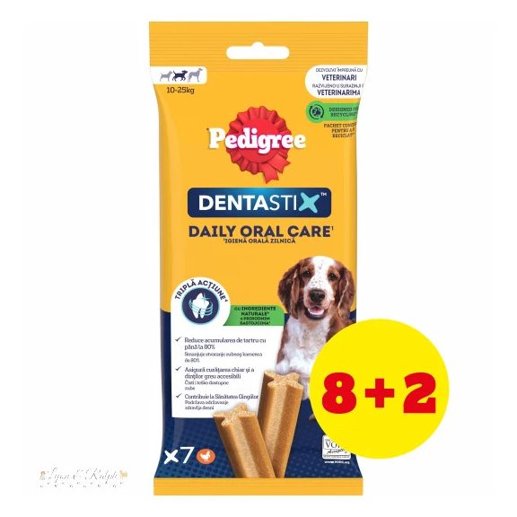 A Pedigree DentaStix egyedülálló X formájának és összetételének köszönhetően a napi használat során segít akár 80%-kal csökkenteni a fogkő lerakódását. Adjon kedvencének naponta ízletes Pedigree DentaStix-et hogy megőrizze fogai és fogínye egészségét. Praktikus egy hétre elegendő csomagolásban kétféle ínycsiklandó ízben.