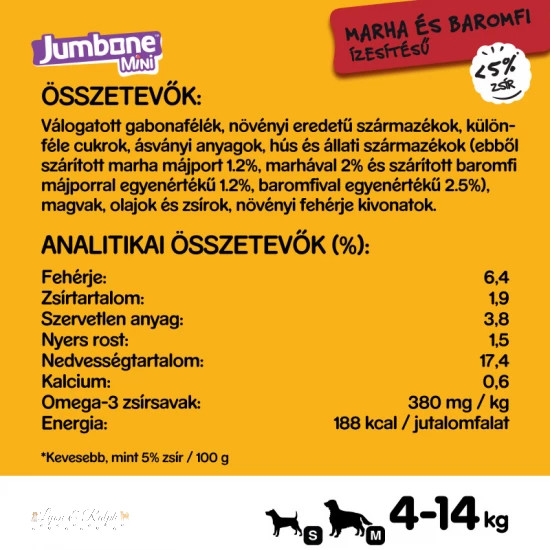 - Nagytestű kutyáknak (25 kg felett), max 5 darab jutalomfalat hetente.