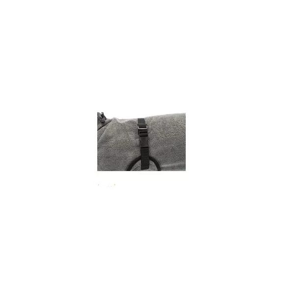 A széles gallér felső részén a gumis zsinór és a szabályozó, deréktájon a csatos pánt, a hátsó lábaknál a patentok gondoskodnak a megfelelő rögzítésről.