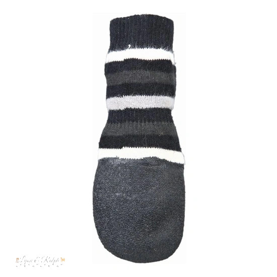 A Trixie csúszásgátló védő zokni segíti a sérült mancsok gyógyulási folyamatát és védi a sérülésektől a tappancsokat. Erős csúszásmentes aljú, így alkalmas idős kutyák számára, vagy lakásban tartott kutyáknál a parketta védelmére. A zokni pamut és elasztán anyaga jól szellőzik. Színe: szürke, fekete. A csomag tartalma: 1 pár zokni. Méret: L. Golden retrievernek, vagy hasonló testméretű kutyáknak ajánlott.